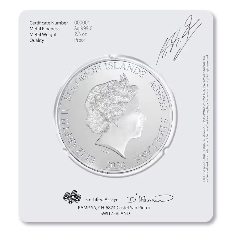 These proof coins are .999 fine silver, 2.5 Troy oz., 2020 issue, legal tender. All the coins in the Michael Schumacher collection are minted by Swiss-based PAMP SA, one of the world’s finest producers of precious metal coins.