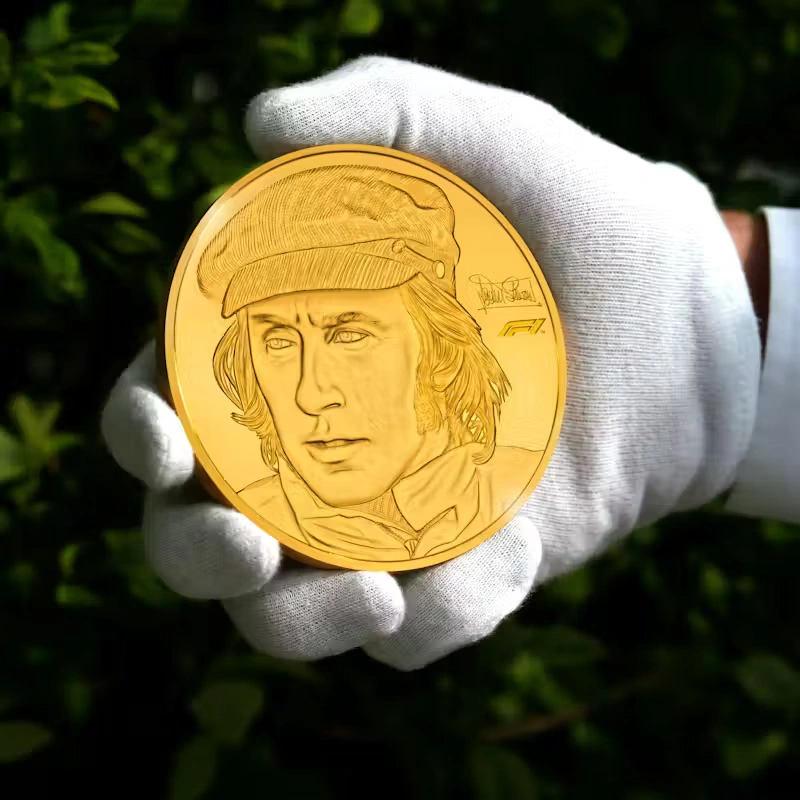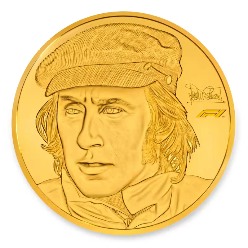 The limited edition Sir Jackie Stewart 1kg gold coin features a historic portrait of Sir Jackie, courtesy of Motorsport Images, together with his signature and the dynamic F1® logo.