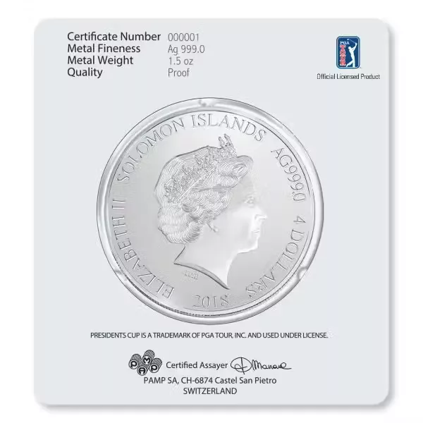 The protective packaging of the coins also shows the 17th green and the lake. The back of each card includes the PGA TOUR Official Licensed Product logo, as well as the certificate number of each coin, and a statement of the fineness and proof quality of the mintage. Also shown is the signature of the Swiss Fondeur Assayer responsible for approving PAMP SA’s products.