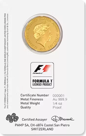 Our beautifully crafted UNITED STATES GRAND PRIX™ coins feature the official F1® logo, the name of the event, and a Formula 1® 2016 car. On the obverse side of the coin is Ian Rank-Broadley’s portrait of Queen Elizabeth II. The packaging includes a Certificate Number, statement of metal fineness, weight, proof quality statement, and the signature of the PAMP assayer.