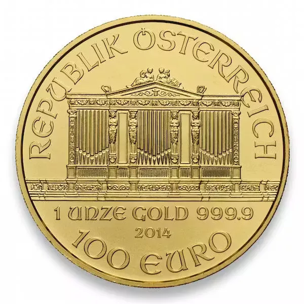 The reverse depicts the great organ found in Vienna’s concert hall, where the famous Vienna Philharmonic Orchestra plays. Above the organ, arching across the top of the coin is “REPUBLIK OSTERREICH”, the official name of the country. Arched below the hall is the denomination, with the coin’s weight, fineness, and date of issue just below the hall.