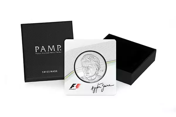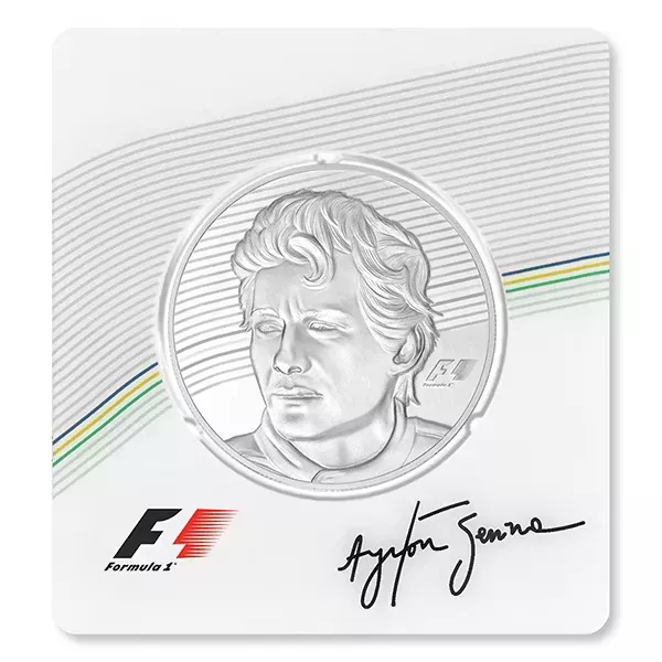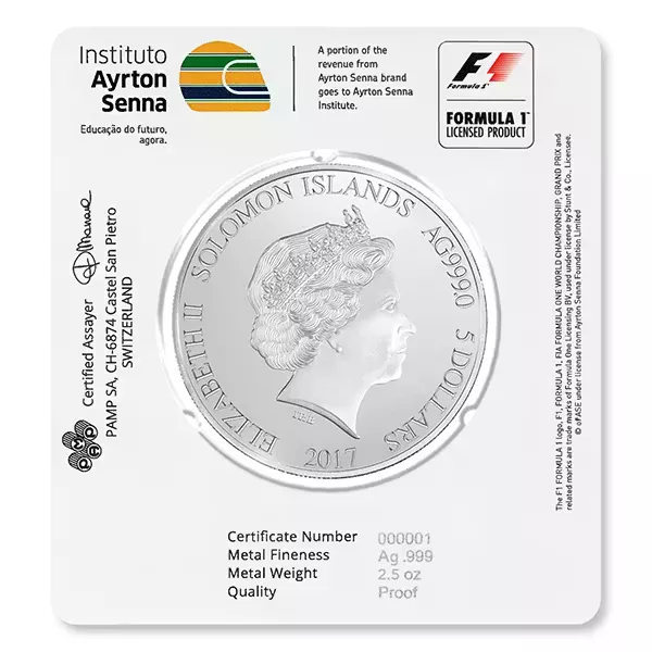 The protective packaging of the coin shows Ayrton Senna’s signature and the Formula 1 logo. The back of each card includes the Senna Insitute’s logo, as well as the certificate number of each coin, and a statement of the fineness and proof quality of the mintage. Also shown is the signature of the Swiss Fondeur Assayer responsible for approving the quality of PAMP SA’s products.
