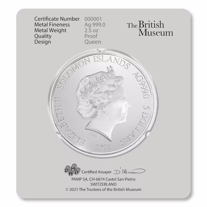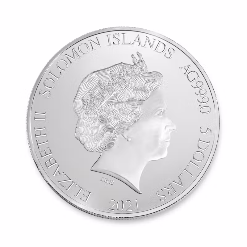 The 2021- issue 2.5 oz, 999.0 fine silver proof coin appears in a strictly limited mintage of 5000. The 50mm diameter, legal tender coin bears a portrait of Her Majesty Queen Elizabeth II on the obverse and is minted by PAMP SA, one of the world’s finest mints.