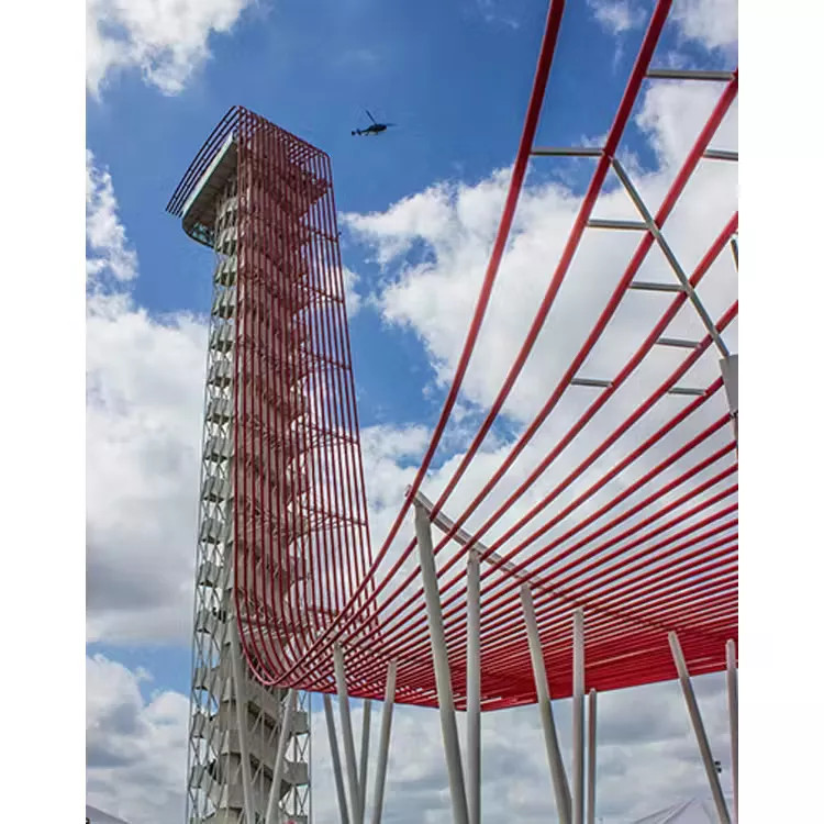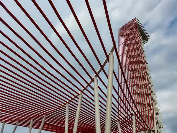 The tower consists of an elevator shaft surrounded by a double helix staircase, with the observation platform providing a 360-degree panorama of the circuit, as well as views to downtown Austin. An array of 18 bright red steel tubes runs up the tower and caps the observation deck.