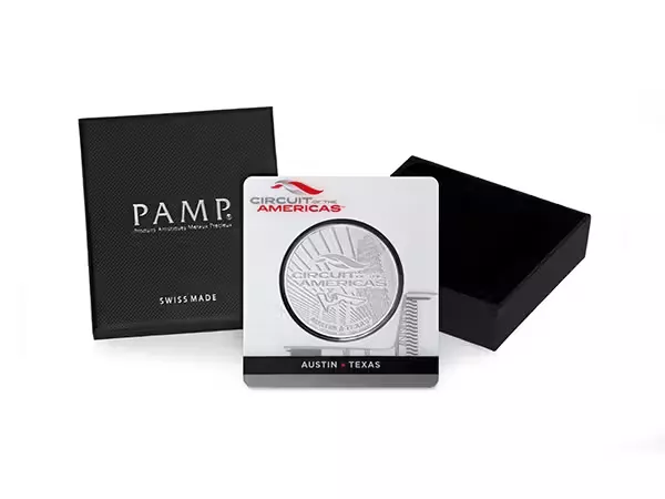 The protective packaging shows the COTA logo and a side view of the tower. The back of each card includes the certificate number of each coin, and a statement of the fineness and proof quality of the mintage. Also shown is the signature of the Swiss Fondeur Assayer responsible for approving PAMP SA’s products.