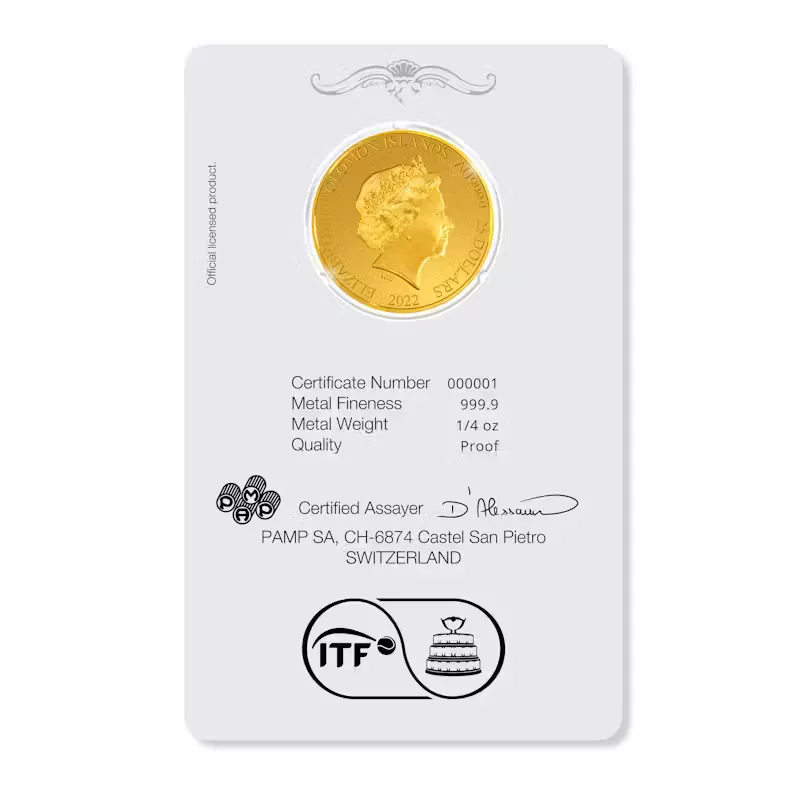 These beautiful, limited edition 2022 coins feature the Davis Cup and are only available from Rosland Capital. The 22mm diameter gold coins are 999.9 fine gold. The coins are legal tender and bear a portrait of Her Majesty Queen Elizabeth II on the obverse. These collectors’ items are specially minted as proofs, their highest level of quality, by the world-famous, Swiss-based PAMP SA. Only 5,000 of these 2022-issue coins are available worldwide.