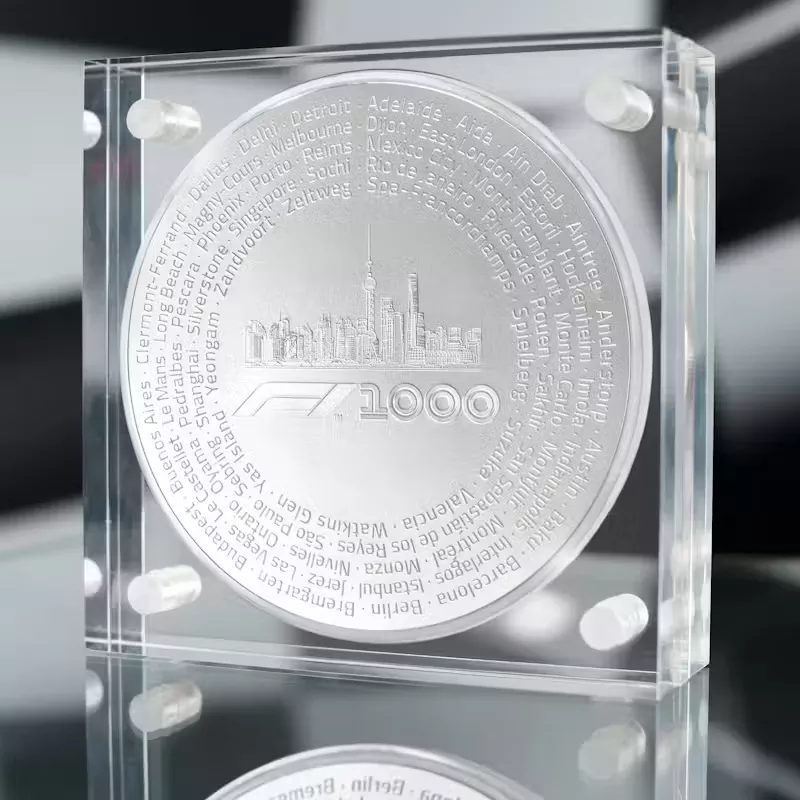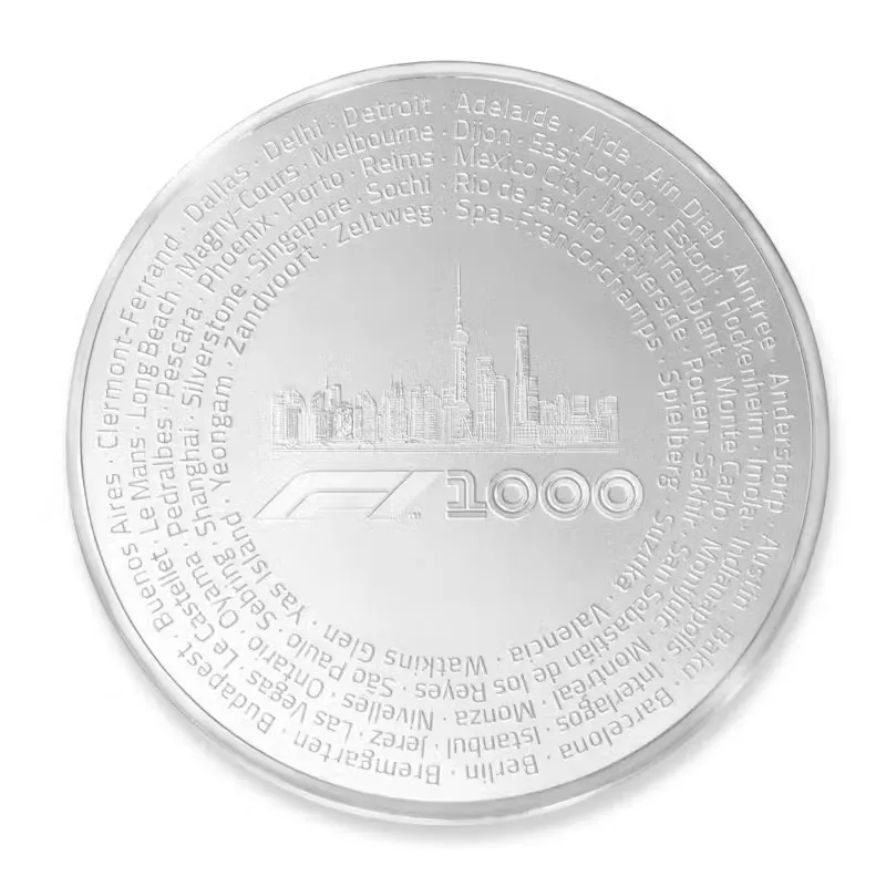 The coin design features the dramatic F1 1000 logo, the skyline of Shanghai, and names of scores of locations that have hosted the FIA Formula One ChampionshipTM since its inception in 1950. The obverse side of the coin features Ian Rank-Broadley’s portrait of Her Majesty Queen Elizabeth II together with the legal tender value of the coin. Each coin is accompanied by commemorative packaging including a certificate number, statement of metal fineness, weight, proof quality statement, and the signature of the Swiss assayer who certifies the work of PAMP SA, one of the world’s finest coin producers. Each coin is individually numbered on its edge, and is packaged with an acrylic display block and a carbonite presentation case.