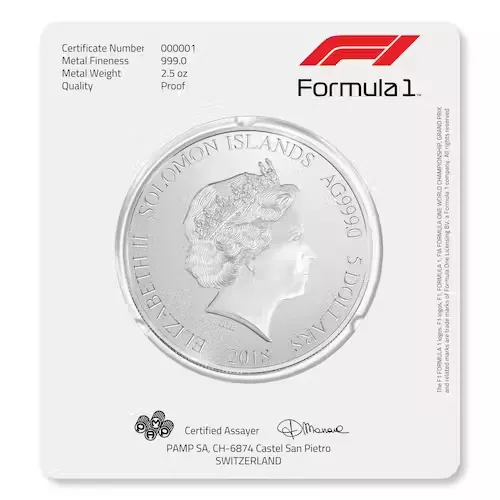 The beautifully-crafted commemorative silver coins list all the race locations in the 2018 season in calendar order around the official F1 logo, shown in the center of the coin, along with a 2018-specification F1 car. On the obverse side of the coin is Ian Rank-Broadley’s portrait of Queen Elizabeth II. The packaging includes a Certificate Number, statement of metal fineness, weight, proof quality statement, and the signature of the PAMP assayer.