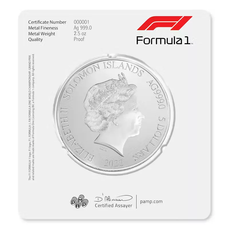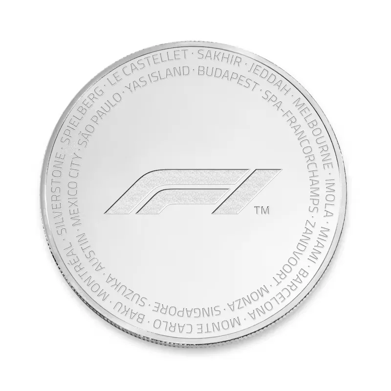 The beautifully-crafted commemorative silver coin lists all the race locations in the 2022 season in calendar order around the official F1 logo, shown in the center of the coin. On the obverse side of the coin is Ian Rank-Broadley’s portrait of Queen Elizabeth II. The packaging includes a Certificate Number, statement of metal fineness, weight, proof quality statement, and the signature of the accredited Swiss assayer at PAMP.
