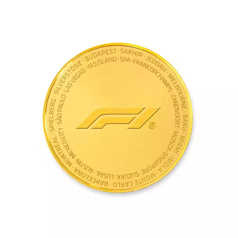 The beautifully crafted commemorative gold proof coin lists all the race locations in the 2023 season in calendar order around the official F1 logo, shown in the center of the coin. On the obverse side of the coin is Ian Rank-Broadley’s portrait of Queen Elizabeth II.