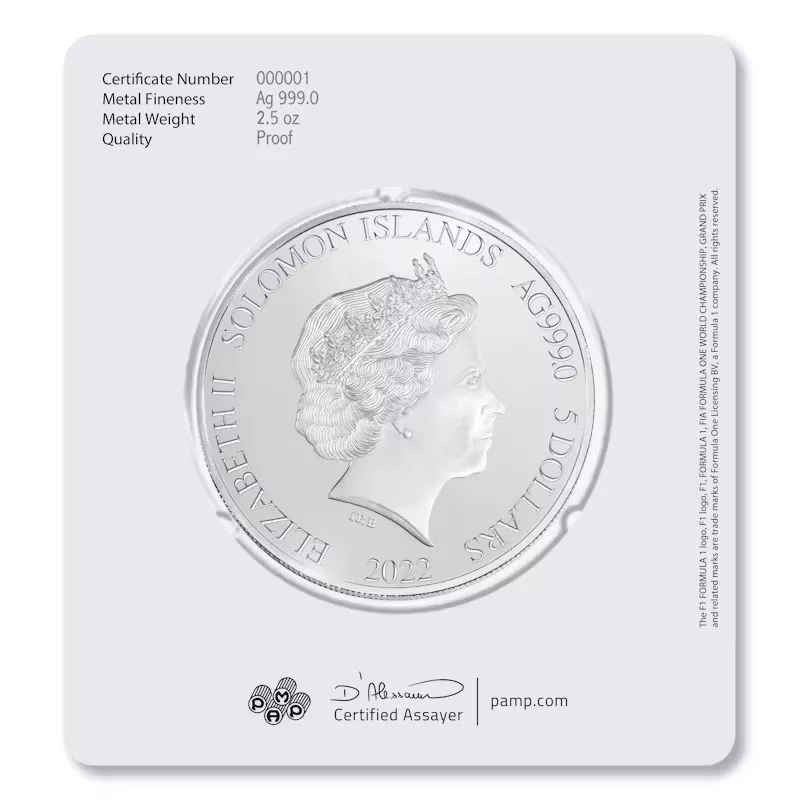 These proof coins are .999 fine silver, 2.5 Troy oz., 2022 issue, legal tender. All the coins in the Michael Schumacher collection are minted by Swiss-based PAMP SA, one of the world’s finest producers of precious metal coins.