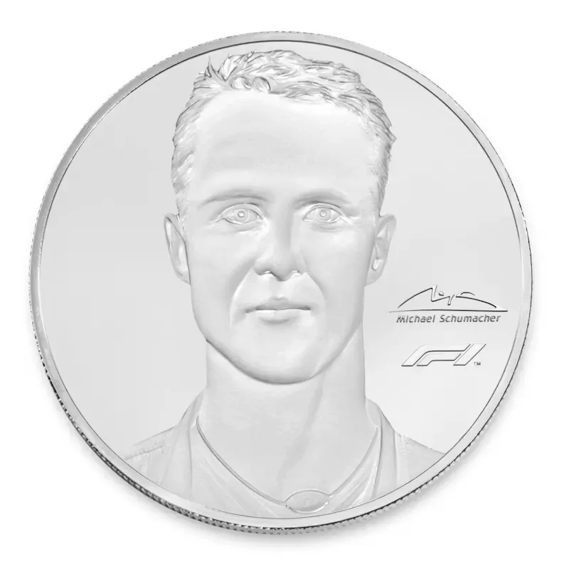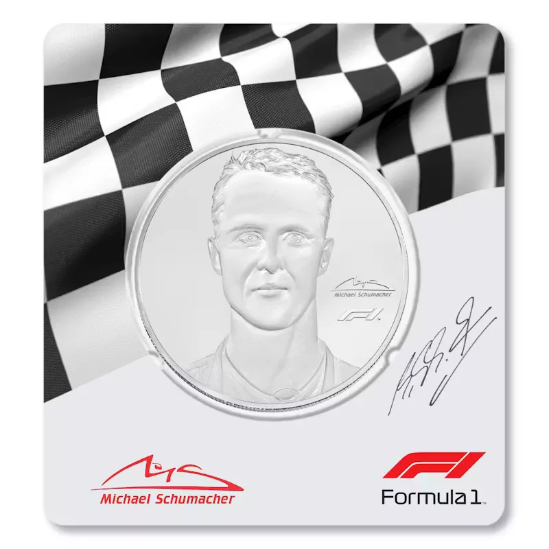 In collaboration with Formula 1®, Rosland now proudly presents a 2022 2.5 oz silver proof coin celebratingthe achievements of Michael Schumacher, seven-time FIA World Champion.