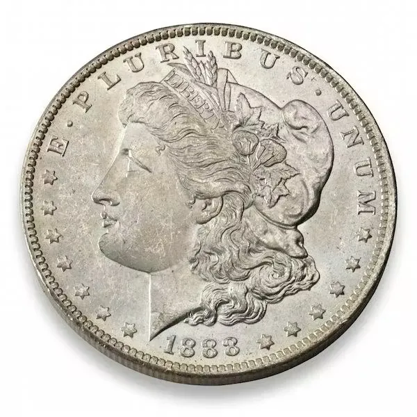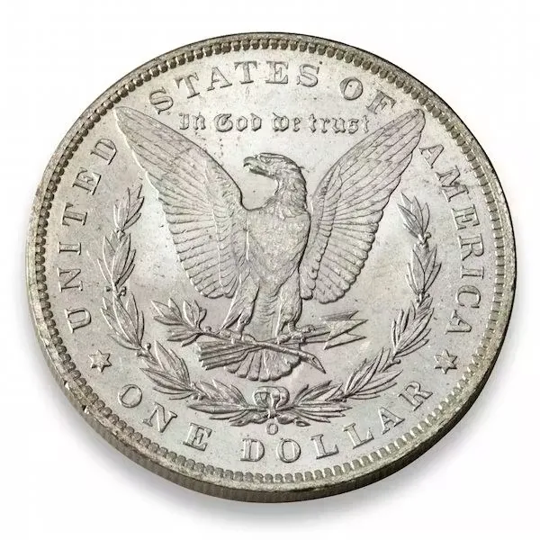The reverse of the Morgan Dollar has an eagle, standing tall and stern, wings spread, partly surrounded by a u-shaped wreath. In the eagle’s talons are arrows and an olive branch. Encircling the coin are the words “UNITED STATES OF AMERICA” and the denomination “ONE DOLLAR.” “In God We Trust” is placed between the bird’s upright wings.