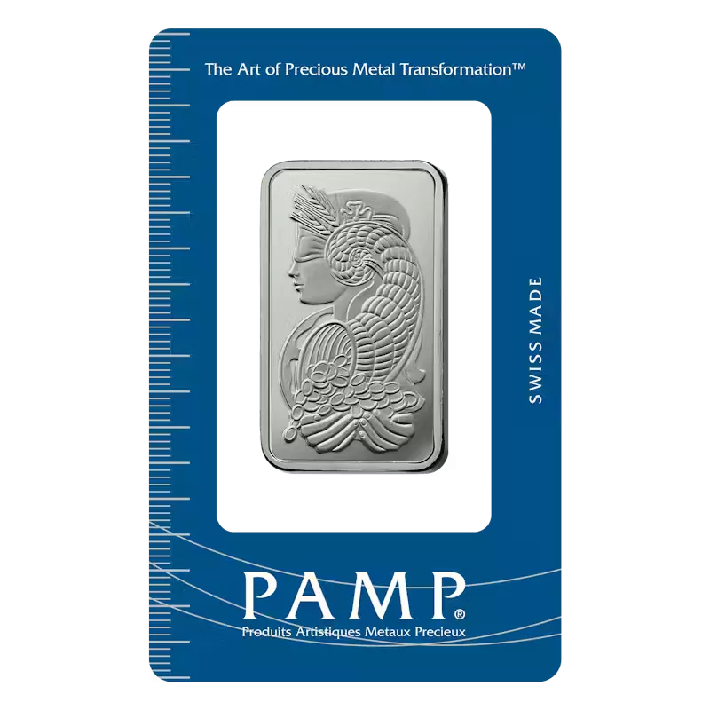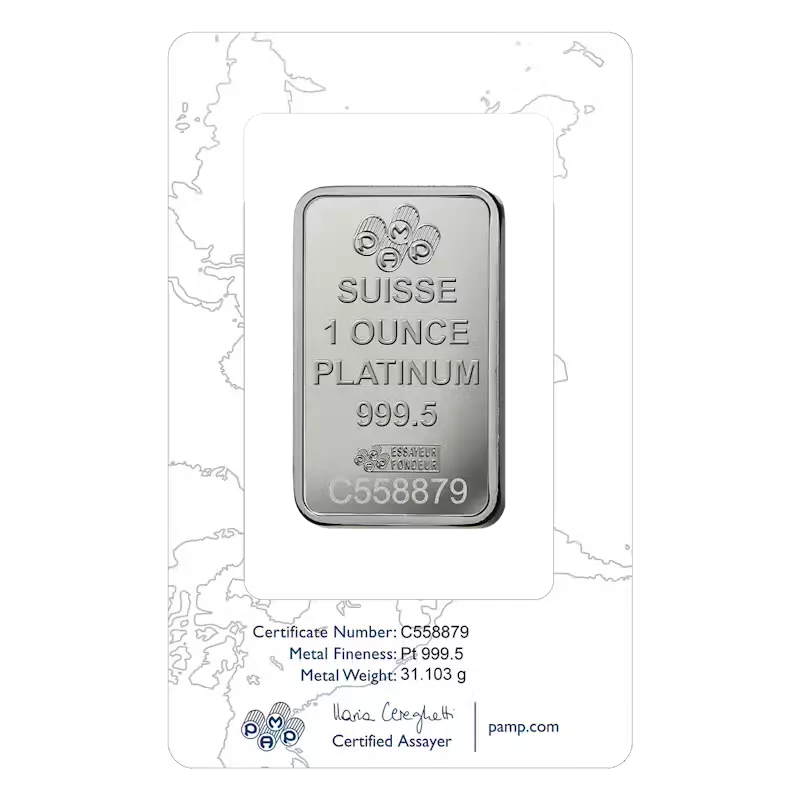PAMP platinum bars are .9995 platinum and have been traded on world markets for more than two decades. Size formats include massive “Good Delivery” bars accepted by major banks and financial institutions. Each bar is registered and sealed in a protective holder, along with a certificate, which guarantees the purity, weight, and platinum content.