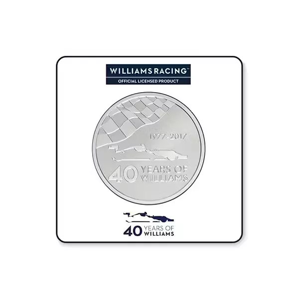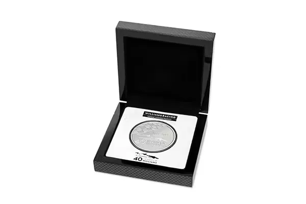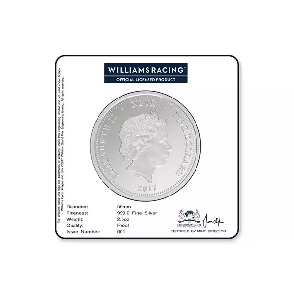 Minted as proofs in the UK by the Commonwealth Mint to celebrate 40 Years of Williams Racing, only 400 of these beautiful coins will ever be offered outside gold and silver sets. Each comes in a presentation box with a certificate of authenticity. The coins are 50mm diameter, weighing 2.5 Oz. The coins are legal tender and bear a portrait of Her Majesty Queen Elizabeth II on the obverse.